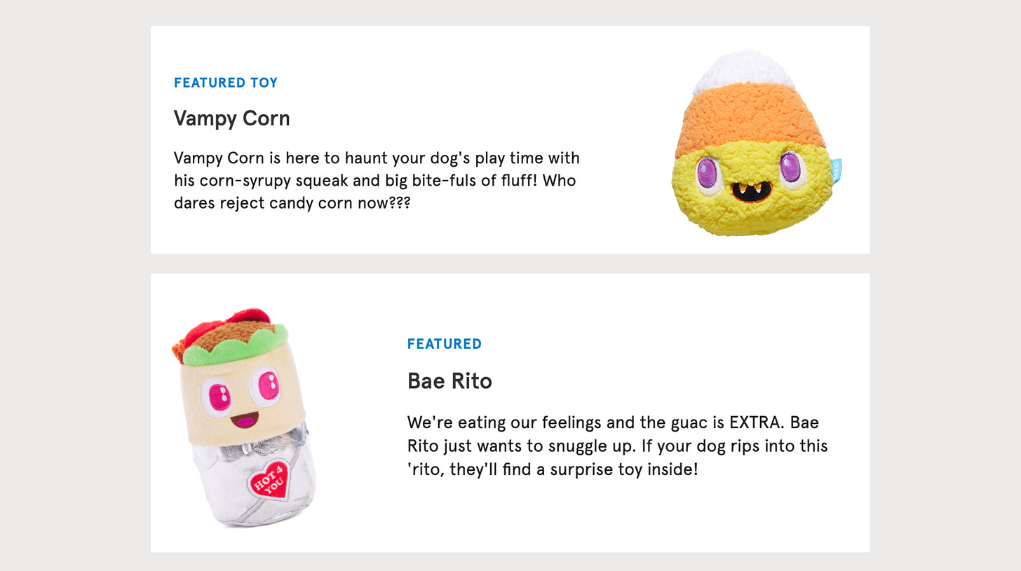 Boxes are only sold one theme at a time, so the website is pretty minimal. However, each box’s featured product descriptions are written for the dog’s benefit, but always include a bit of fun for the humans, too.