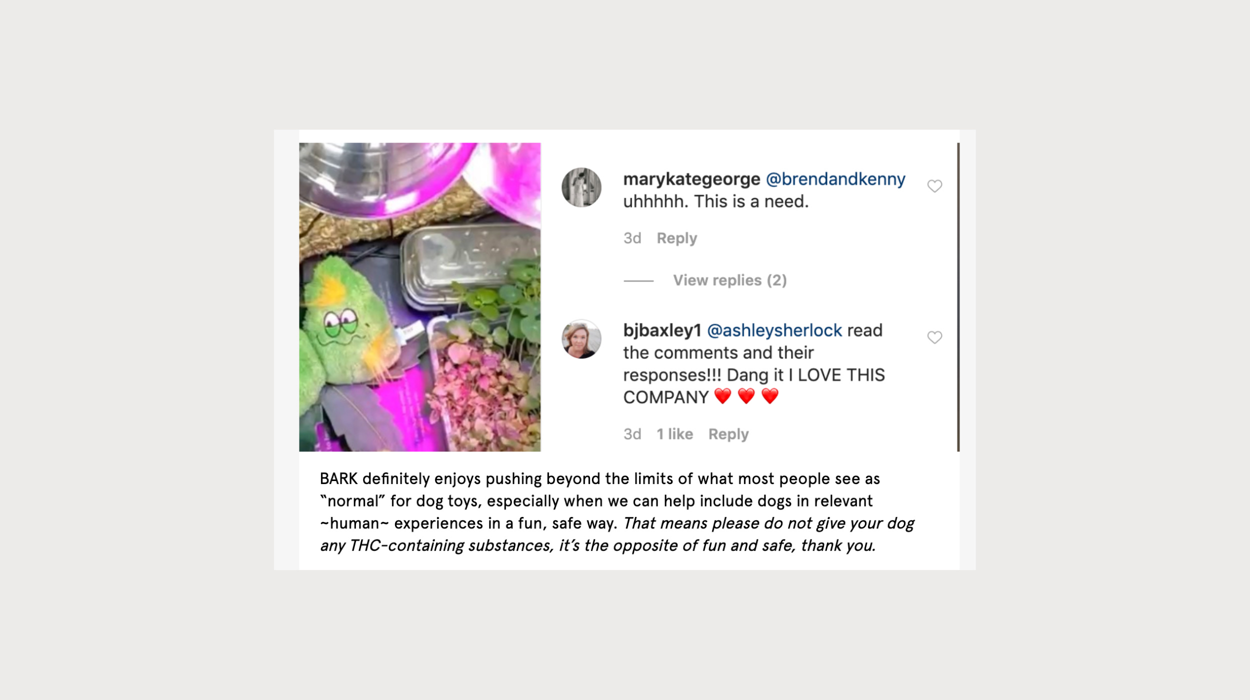 And of course, there’s social. At first glance you might think the voice is all puns, but they’ve truly embraced the idea of fun in all of its forms, never taking the dog toy business too seriously. The BarkBox team shatters the social media manager fourth wall, celebrates all areas of interest, and knows how to take the joke further for those who enjoy it.
